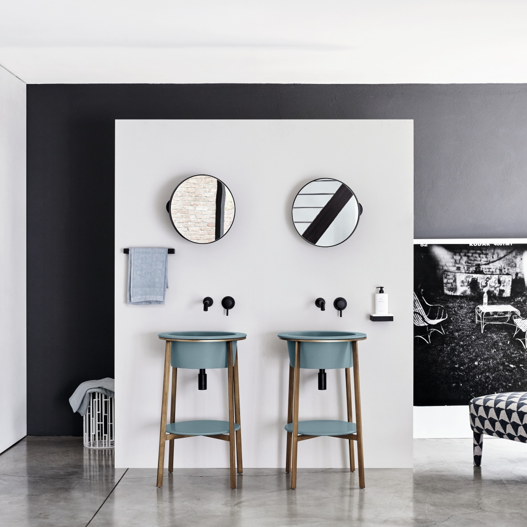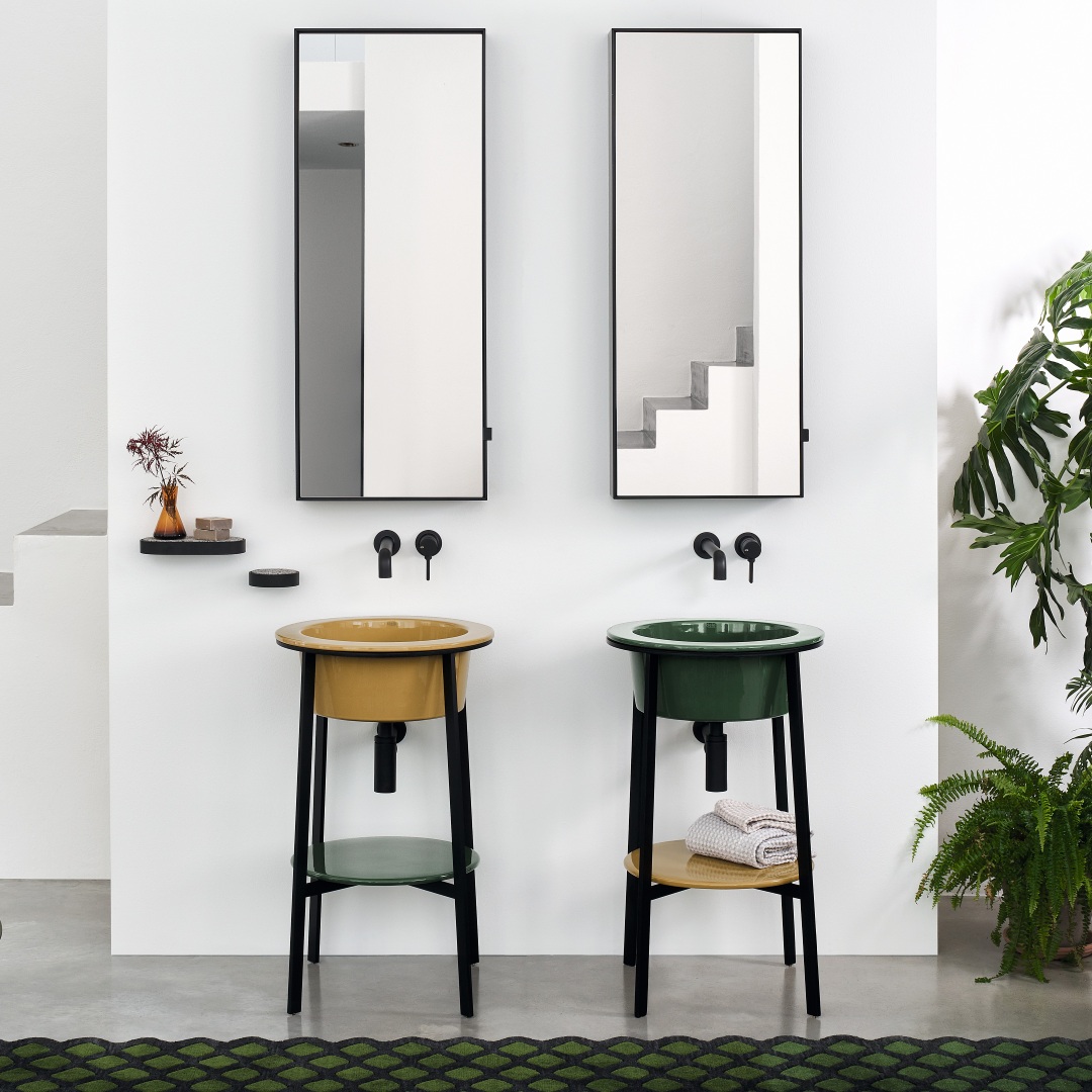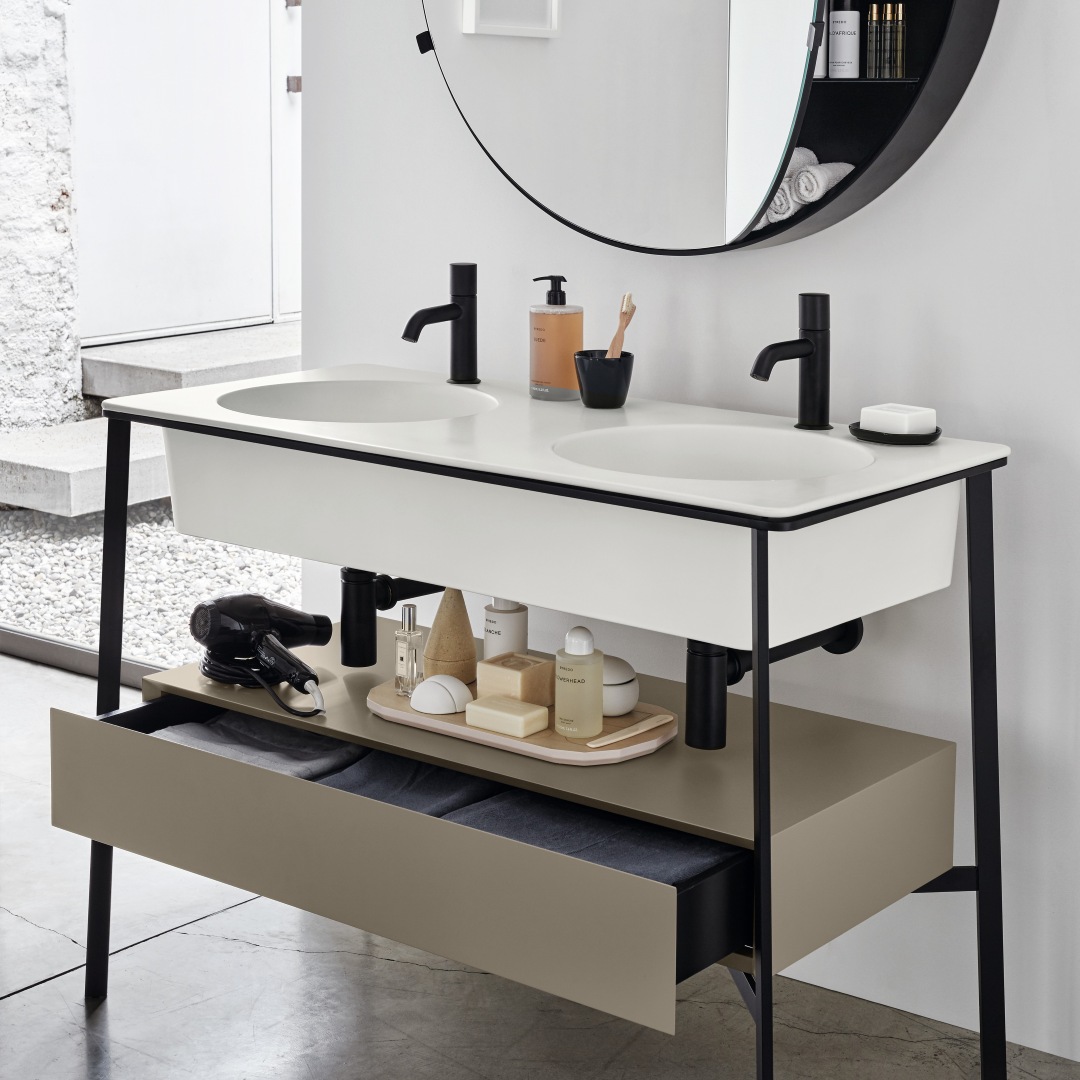 Série I Catini od Cielo představuje kolekci koupelnového nábytku ve čtyřech variantách – Tondo, Ovale, Doppio a Rettangolare. Jde o čtyři rozdílné interpretace jednoho produktu, které harmonicky spojují ocelovou konstrukci s keramickými umyvadly a keramickými nebo mramorovými policemi, doplněnými o praktickou úložnou zásuvku.